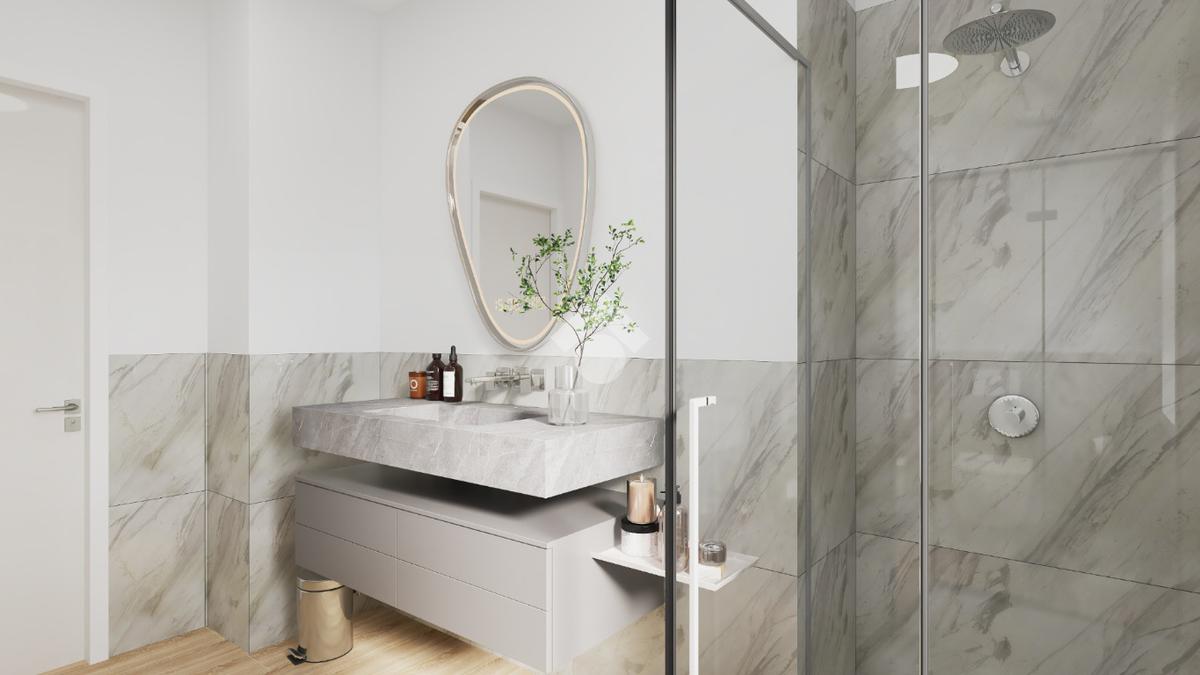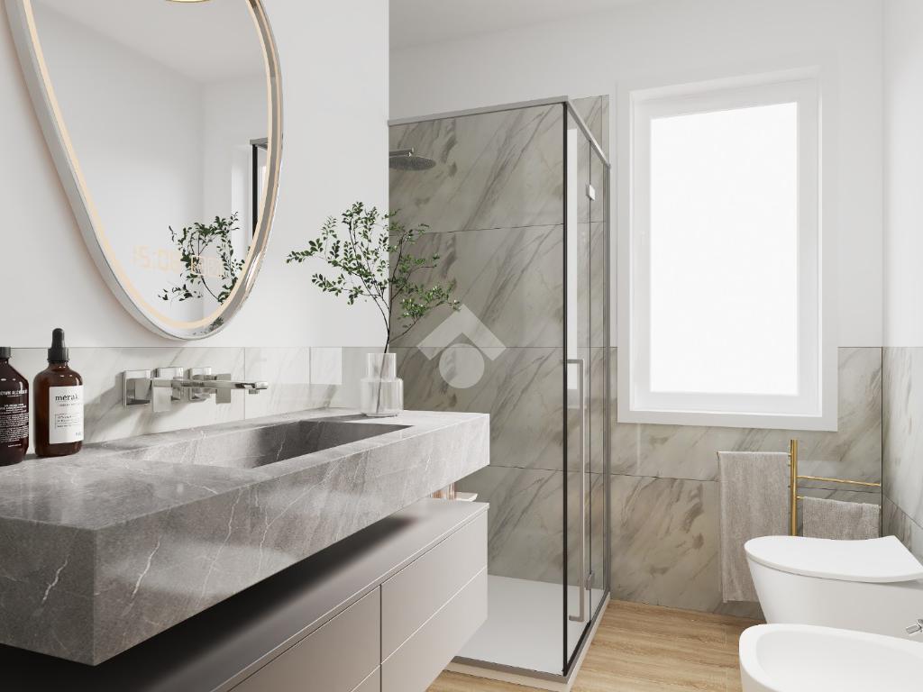 I doppi servizi, arredati con grande attenzione ai dettagli, presentano sanitari sospesi in ceramica dal design moderno, piatti doccia effetto pietra e miscelatori Jacuzzi. Il bagno padronale, con il suo rivestimento grigio dalle venature bronzo, trasmette un'eleganza raffinata, mentre il bagno di servizio, con il suo aspetto marmoreo opaco, aggiunge un tocco di classe all'ambiente.