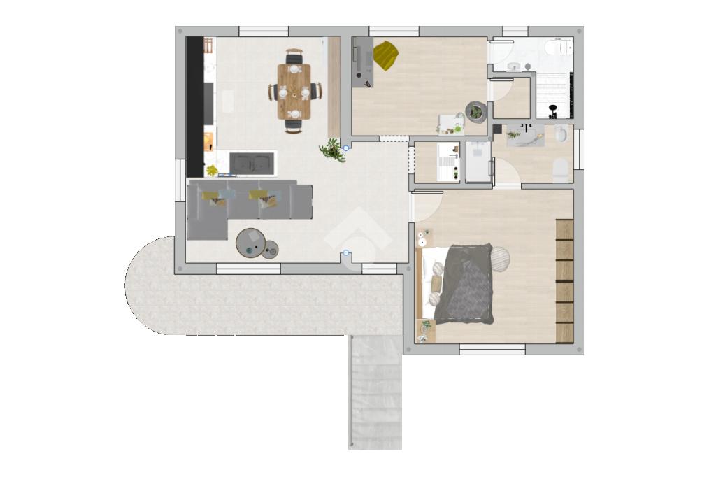 La zona giorno open space, luminosa e ariosa, è perfetta per momenti di convivialità e relax. La zona notte offre una camera da letto matrimoniale con bagno privato dotato di doccia e un secondo locale versatile, utilizzabile come studio o cameretta, anch'esso con bagno annesso con doccia. Un comodo vano lavanderia completa il piano, con la possibilità di trasformarlo in un ulteriore bagno di servizio cieco.